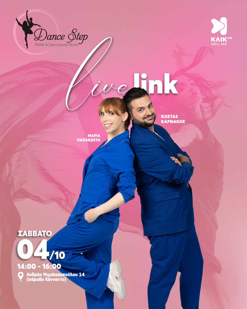 Εγκαίνια με άρωμα... χορού! Μετά την Λάρνακα και την Λεμεσό, το κατάστημα Dance Step ανοίγει τις πύλες του και στην Λευκωσία, στην Ανδρέα Μιχαλακοπούλου 14 (πάροδο Κέννεντυ), με ένα party από τις 10 το πρωί έως 6 το απόγευμα. Ο Κώστας Καρνάκης και η Μαρία Παπακώστα θα σας προσφέρουν το πιο χορευτικό live link του ΚΛΙΚ FM, 2 με 4, από το νέο Dance Step. Celebrities, μουσική, εκπλήξεις και 20% έκπτωση σε όσους παρευρεθούν.